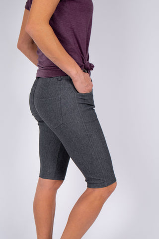 Bermuda length jeggings featuring a light sheen and jean-style construction Lightweight, breathable cotton-blend material for all-day comfort Belt loops with 5 functional pockets Super Stretchy Pull up Style Composition: 70% Cotton, 25% Polyester, 5% Spandex
