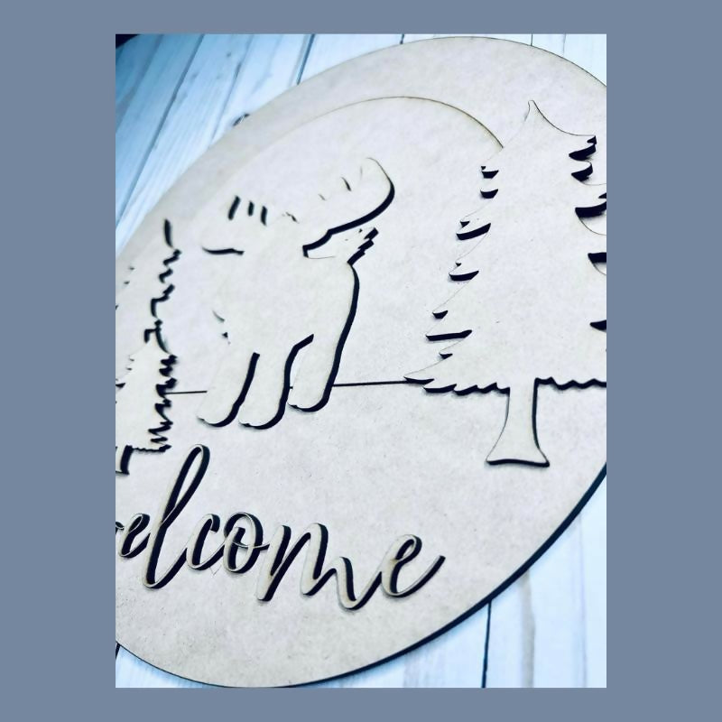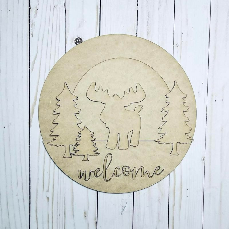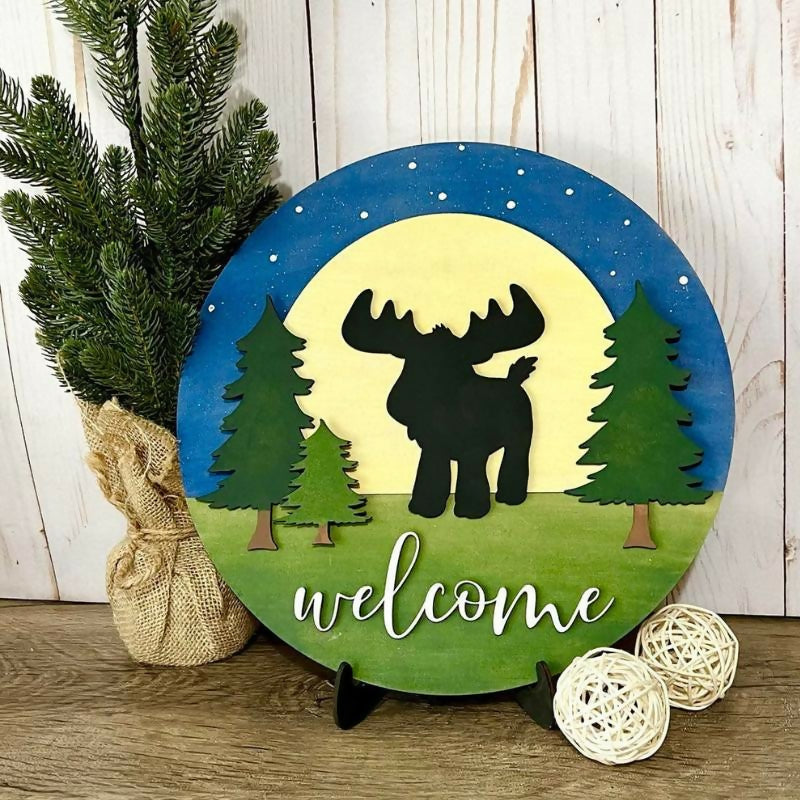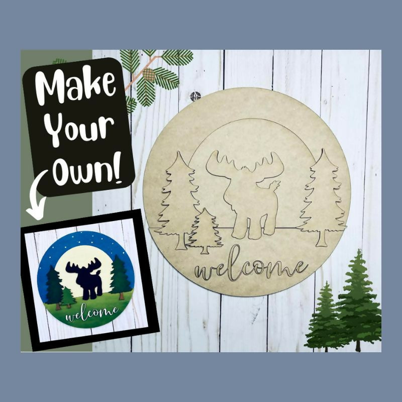 Welcome guests to your home with the majestic beauty of the wilderness captured in our "Welcome" Moose DIY Craft Kit! This enchanting kit allows you to create a serene night setting featuring a stately moose, a sky filled with twinkling stars, a luminous full moon, and a backdrop of the woods. Perfect for nature lovers and craft enthusiasts alike, this kit provides all the materials you need to assemble a striking piece of decor that brings a touch of the great outdoors into your living space. Just add paint! With the warm greeting "Welcome" included, this kit is sure to add a welcoming and rustic charm to any entrance or room.