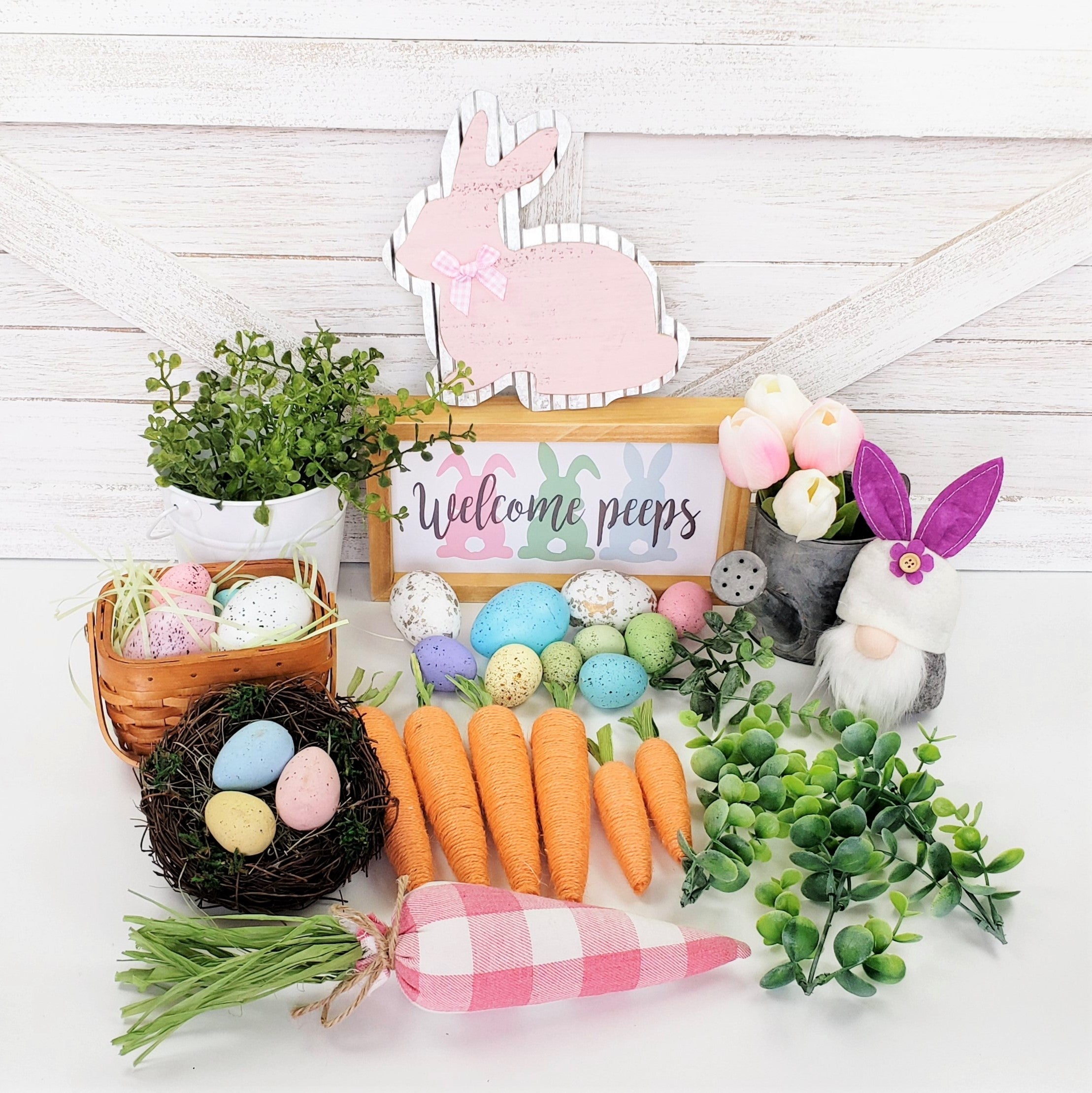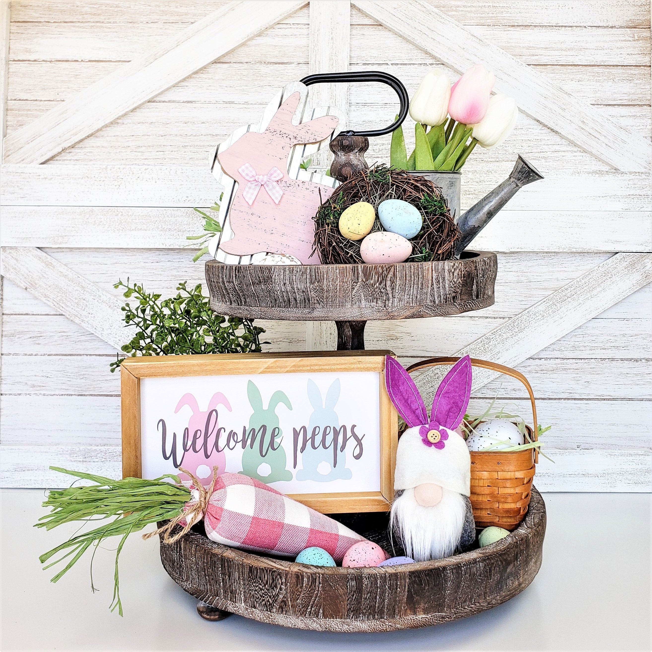 Transform your tiered tray, shelf or mantel into a stunning display with our Welcome Peeps decor set. With a variety of heights, colors, and textures carefully selected for perfect coordination, this set offers unbeatable value. Why spend time hunting for matching pieces when we've done it for you? Simply sit back and watch as your space is transformed with ease!