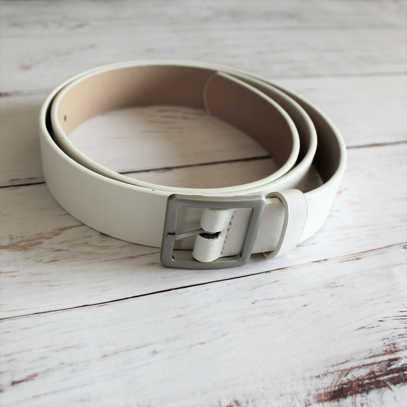 Super cute white belt with brushed silver square buckle. This belt is the perfect addition to your summer wardrobe.