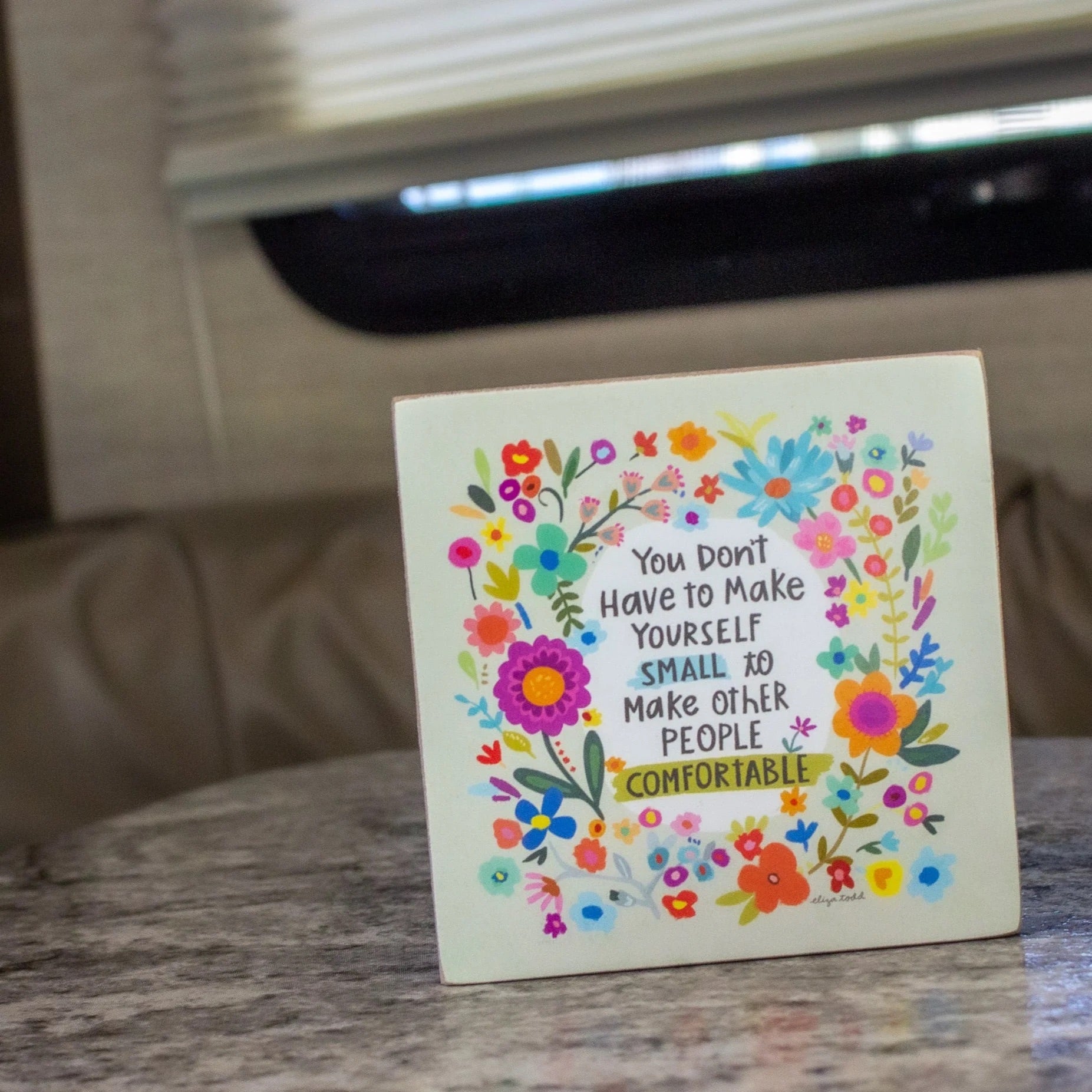 Meet THE inspirational accent you've been searching for - and display it YOUR way! This is the perfect reminder that you don't have to quiet your personality or dreams because they're too big for some! The vibrant hand illustrated design adds an adorable pop of color to home offices, dorm rooms - and even your bedside table! Pick a place in your home, car - even RV - where you'll see this message often...or gift it to someone who needs to hear it!