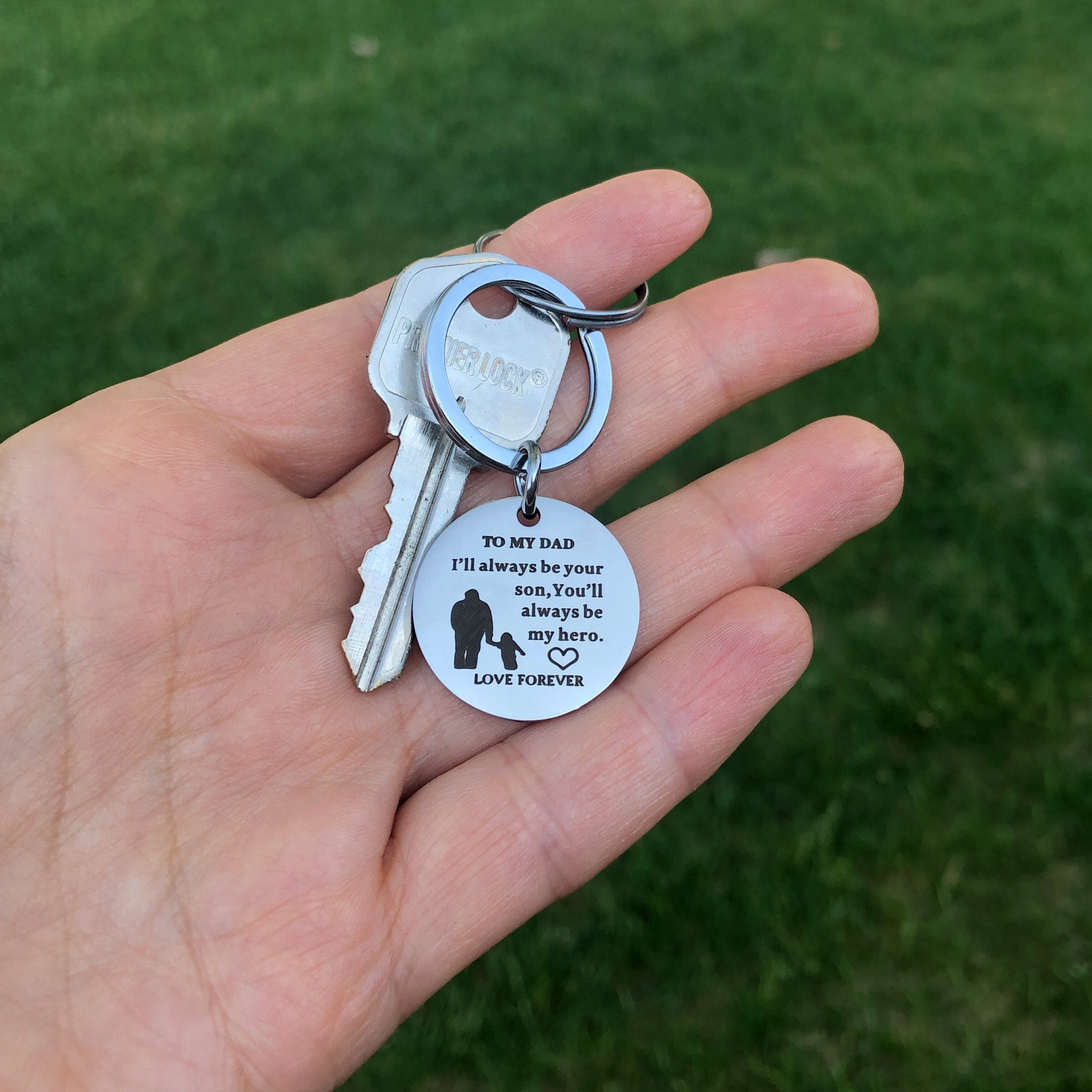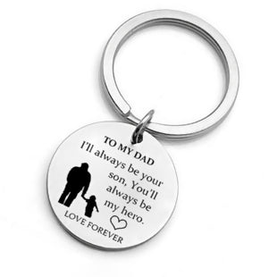 Let your dad know just how much you look up to him with the "you're my hero" keychain. Fathers crave respect and admiration from their sons and what a better way to show him than with this daily reminder! He will see it everyday as he drives to and from work and home, knowing that his son values him and the sacrifices he makes for his family.